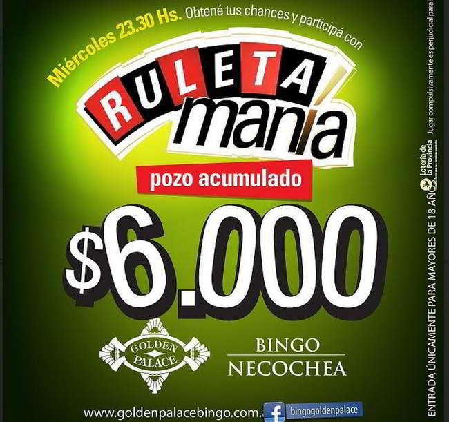 Los días miércoles en Bingo Golden Palace, ubicado en calle 61 esquina 64 de Necochea, el público puede disfrutar de una variedad de promociones especiales y premios acumulados, con entrada general sin cargo para mayores de 18 años.