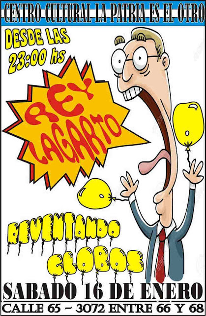 El evento tendrá lugar en el Centro Cultural «La Patria es el Otro», ubicado en calle 65 Nº 3072, presentándose en esta oportunidad el power trio «Rey Lagarto». integrado por Arnaldo Sejas, Juanjo Yolando, y Luis Fernando Oyola, con su espectáculo denominado «Reventando Globos: una unificación de la inmolación social a la que se resiste de manera antigenuflexa y armónicamente inestable».