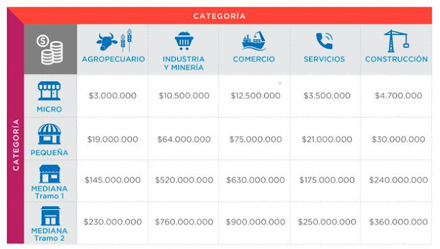 En general, los topes de los valores máximos de ventas totales anuales han escalado entre un 40 y un 45 %, dependiendo del rubro. Por ejemplo, para el sector agropecuario, los límites para considerar a una empresa como micro ascendieron de 2 a 3 millones de pesos, como pequeña de 13 a 19, como mediana Tramo I de 100 a 145, y como mediana Tramo II de 160 a 230 millones.