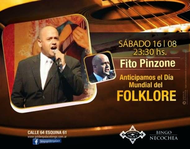 Necochea, Viernes 15 de Agosto de 2014. Mañana Sábado 16 de Agosto a partir de las 23.30 hs, Bingo Golden Palace anticipa los festejos del “Día Mundial del Folklore” con un gran despliegue musical del interprete y compositor “Fito Pinzone” y su banda musical.
