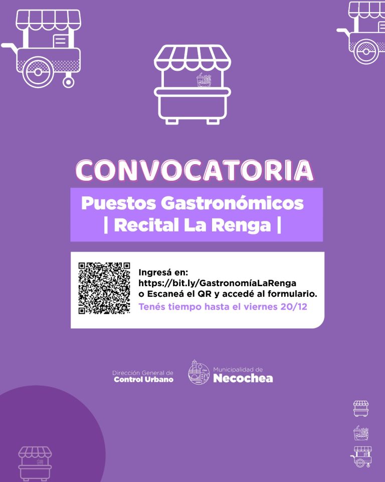 La Municipalidad de Necochea lanzó una convocatoria para los elaboradores gastronómicos que quieran forman parte de los corredores que se armarán en zonas aledañas al Polideportivo “Edgardo Hugo Yelpo” con motivo de la realización del recital de La Renga, el próximo sábado 28 de diciembre.