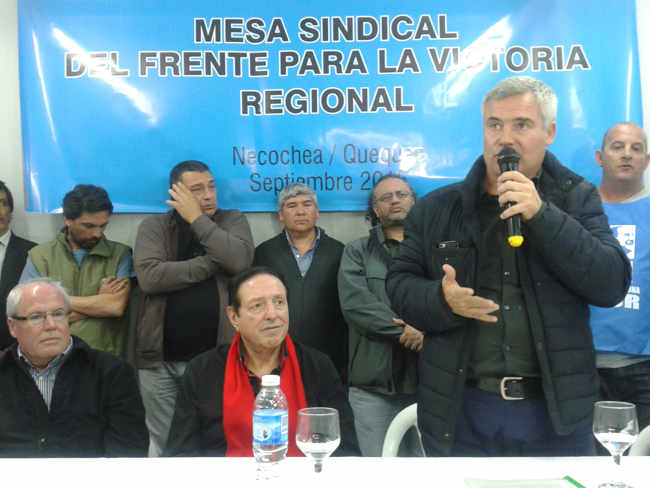 De esta manera, quedó conformada la Mesa Sindical del FpV a nivel local, compuesta por la Asociación de Empleados Fiscales e Ingresos Públicos (AEFIP), el Sindicato de Trabajadores de la Industria de la Alimentación (STIA), el Sindicato de Choferes de Camiones, la Asociación de Guardavidas Necochea-Quequén, el Sindicato de Trabajadores Municipales, la Agrupación «Arturo Jauretche» de SADOP, el Sindicato de ANSES, el Sindicato de Mecánicos y Afines al Transporte Automotor, el SOMU (Sindicato de Obreros Marítimos Unidos), el SUPARA (Sindicato Único del Personal de Aduana de la República Argentina), el Sindicato Único de Trabajadores de Cultos y Religiones, ATSA (Asociación de Trabajadores de la Sanidad), el Sindicato de Remiseros, UPCN (Unión de Personal Civil de la Nación), la Unión Ferroviaria, la Agrupación de Periodistas «Rodolfo Walsh», ATCOA, ATCADe, SUPA, el Sindicato Terminal Quequén, AMS y el Sindicato de Trabajadores de la Industria del Gas.