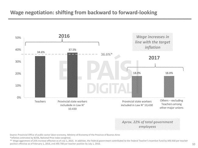 Pero la novedad es que el caso docente es también testigo “hacia afuera” y es presentado a los potenciales inversores extranjeros como un punto de lo que la gestión provincial califica como “proceso de normalización” y que abarca el primer año de Vidal. El documento refuerza y aclara que existe actualmente en el gobierno bonaerense una buena predisposición a reencauzar las cuentas provinciales por la vía del ajuste salarial.
