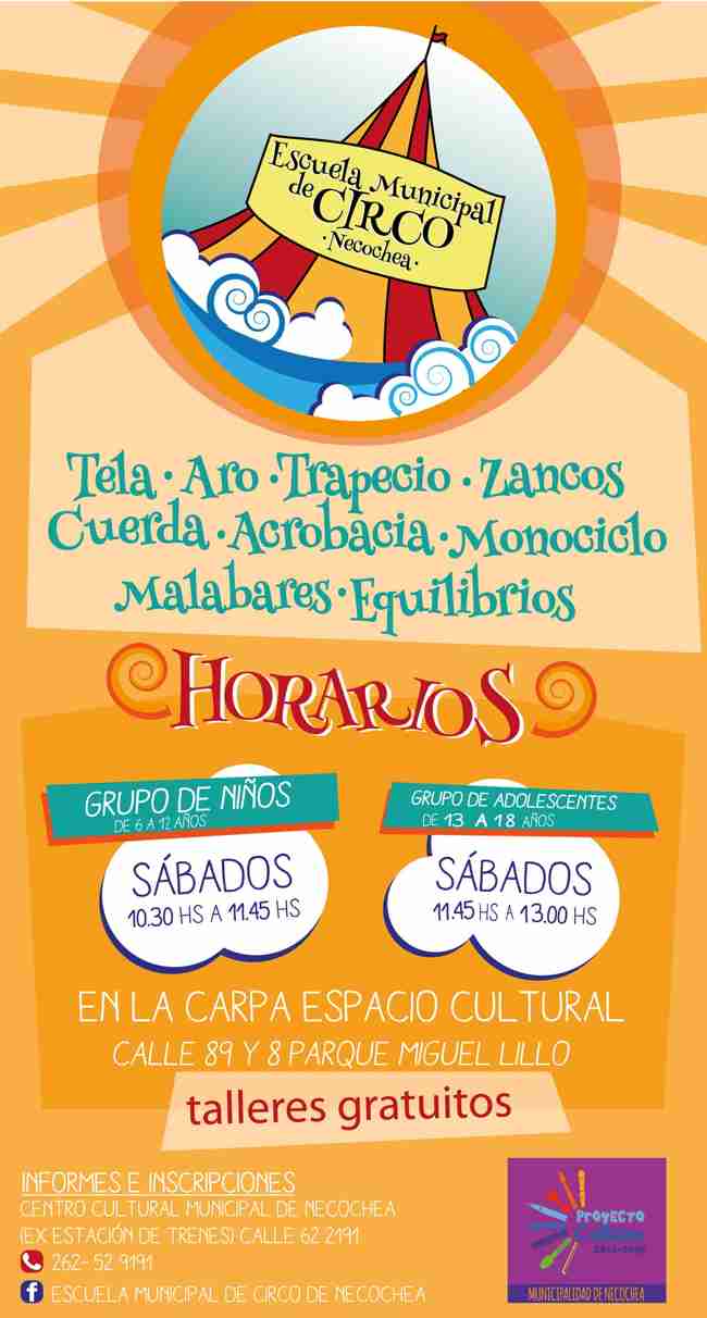 Aquellos interesados en inscripción o más información pueden dirigirse al Centro Cultural Municipal en calle 62 Nº 2191, llamar al teléfono fijo 52-9191 o bien a través del Facebook Escuela Municipal de Circo de Necochea.