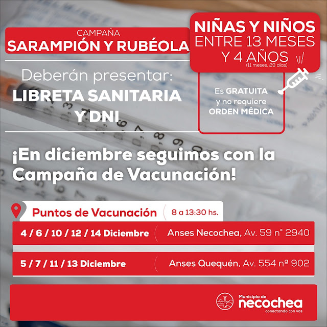 Luego del balance positivo que arrojaron las autoridades municipales con el casi 80% de los niños vacunados contra el Sarampión y la Rubéola, se decidió dilatar unos días más los operativos y se aplicarán en oficinas de ANSES de Necochea y Quequén.