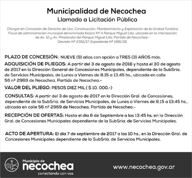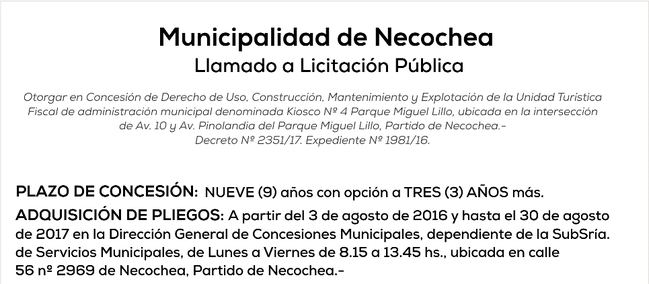 La Dirección General de Concesiones Municipales, dependiente de la Subsecretaría de Servicios Municipales, lanzó un nuevo llamado a Licitación Pública para otorgar en Concesión de Uso, Construcción, Mantenimiento y Explotación, por un plazo de nueve (9) años con opción a tres (3) más, la Unidad Turística Fiscal de administración municipal denominada “Kiosco N° 4” del Parque Miguel Lillo”, ubicada en la intersección de avenidas 10 y Pinolandia.