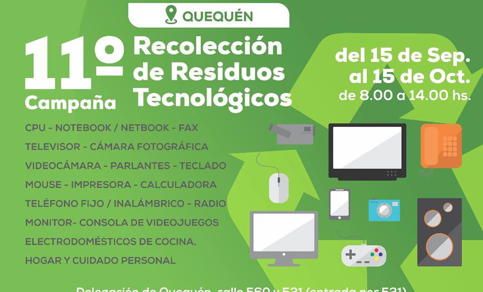 La Dirección de Gestión Ambiental y la Delegación de Quequén anuncian que la 11º campaña de Recolección de Residuos Tecnológicos se pone en marcha. En esta ocasión, desde el 15 de septiembre al 15 de octubre, de 8 a 14, los interesados podrán dejar su tecnología en desuso en la mencionada dependencia municipal, ubicada en calle 560 y 521.