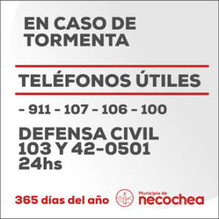 La Dirección de Defensa Civil de la Municipalidad de Necochea informa que persisten vigentes dos alertas del Servicio Meteorológico Nacional para el sur de la Provincia de Buenos Aires que podrían afectar a nuestro Distrito.