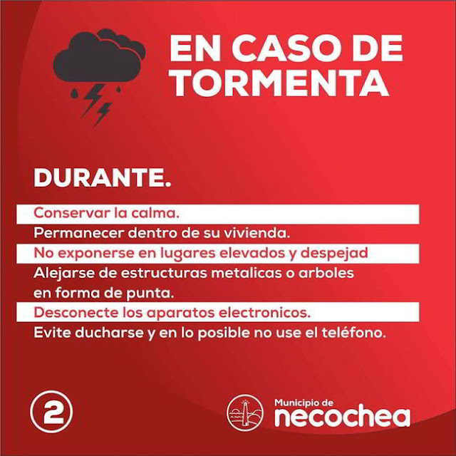 Por tal motivo y ante la probable presencia de fuertes tormentas, desde el área municipal recomendaron conservar la calma, permanecer dentro de las viviendas, no exponerse en lugares elevados y despejados, alejarse de estructuras metálicas o árboles en forma de punta, desconectar los aparatos eléctricos y evitar ducharse o usar teléfonos.