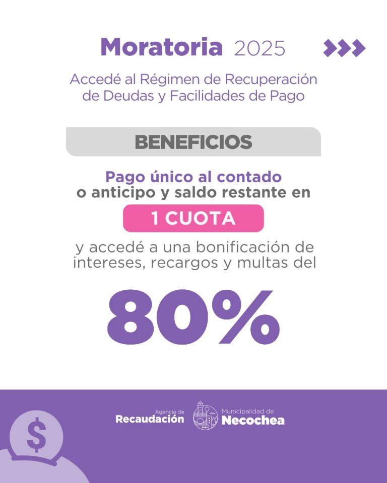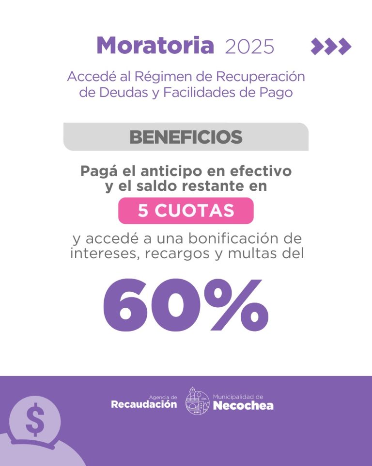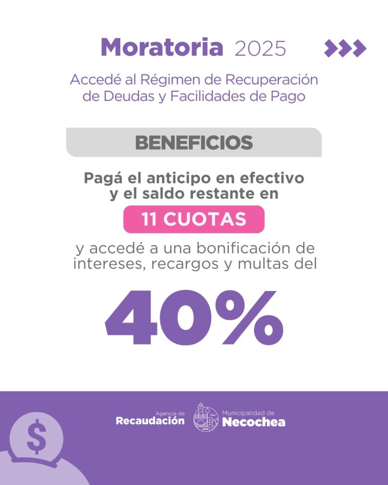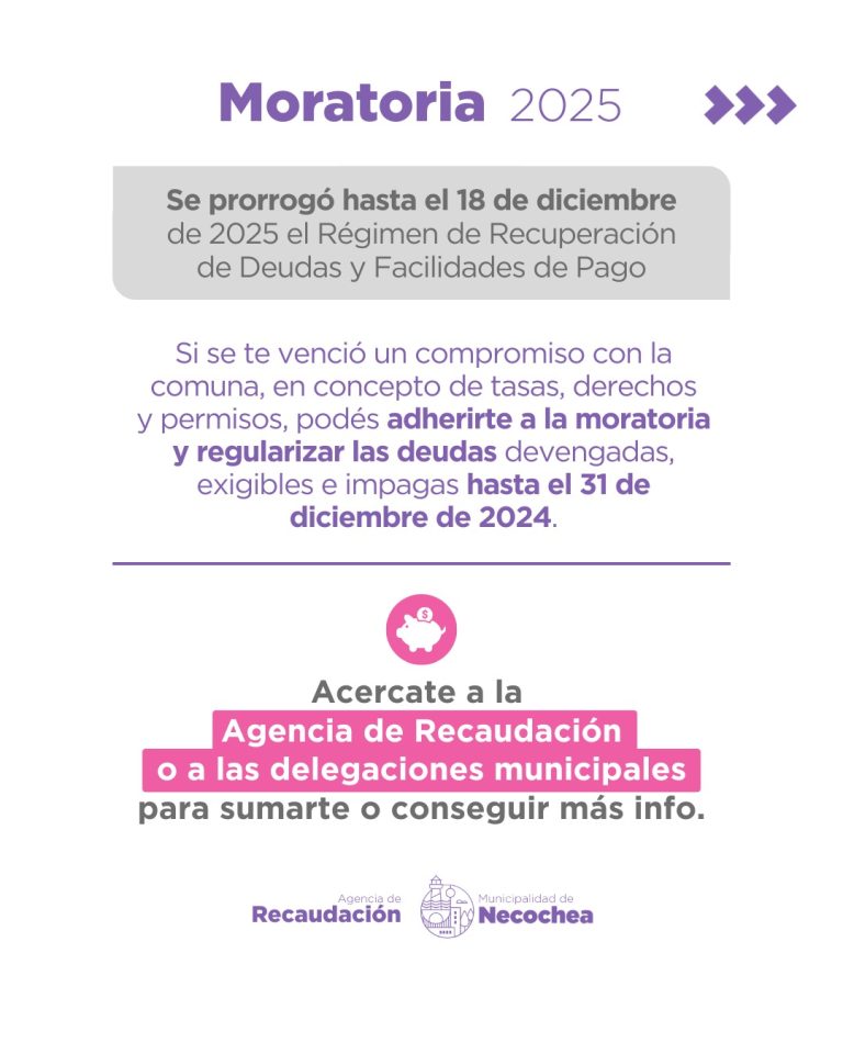 La Agencia de Recaudación de la Municipalidad de Necochea informó que se prorrogó hasta el 18 de diciembre de 2025 el Régimen de Recuperación de Deudas y Facilidades de Pago, conocido como Moratoria 2025. Esta herramienta está destinada a vecinos y contribuyentes que tengan compromisos vencidos con la comuna, en concepto de tasas, derechos y permisos.