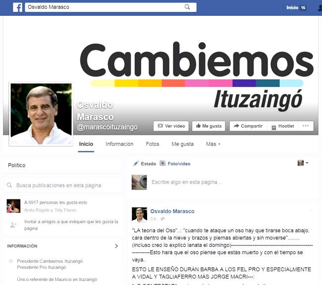 Se llama Osvaldo Marasco, es contador, dirigente del PRO de Ituzaingó y ex candidato a intendente en 2015. Prendió el ventilador y no se salvó nadie. Entre la catarata de cuestiones que desparrama a través de su muro de Facebook, da cuenta de algunas situaciones que podrían ser caratuladas de ilícitos.