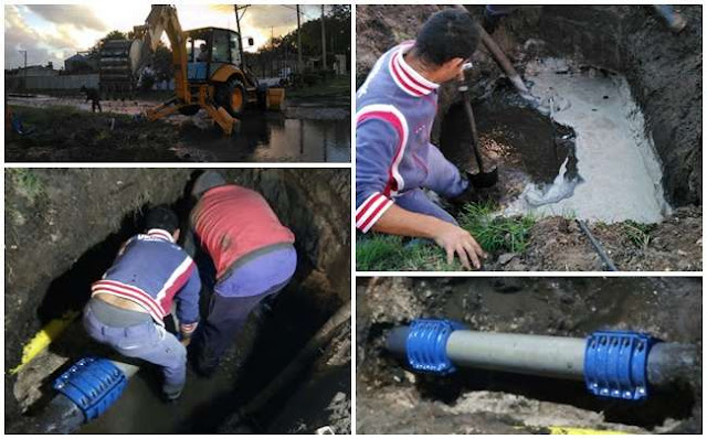 Luego de 8 horas de arduo trabajo una cuadrilla de Obras Sanitarias, logró reparar la rotura de un caño maestro de agua y solucionar el inconveniente que afectaba a la comunidad de Quequén.