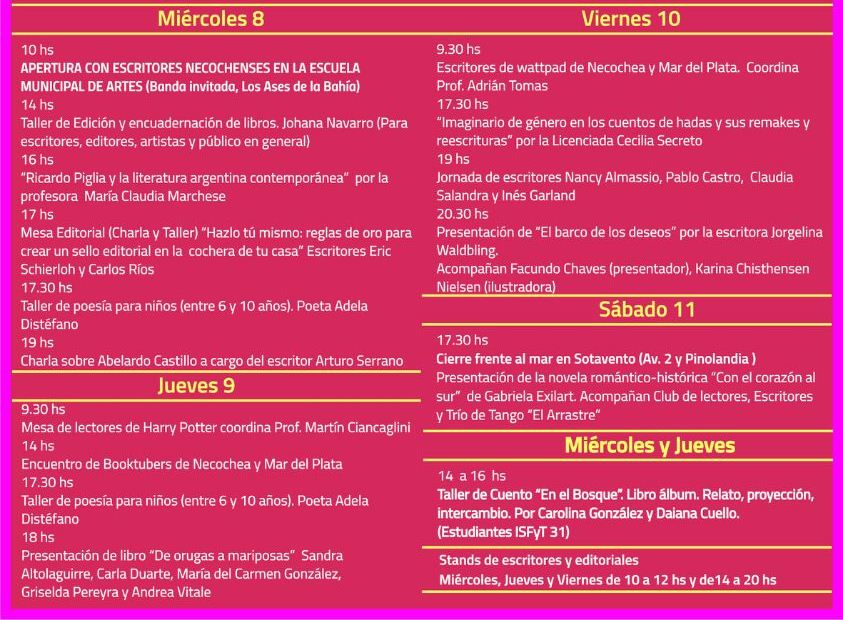 El encuentro empezará el miércoles 8 a las 10, con la apertura a cargo de escritores necochenses y con la música de la banda invitada Los Ases de la Bahía.