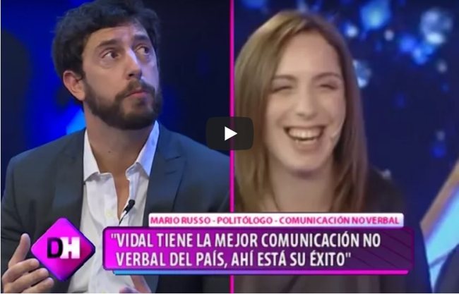 El politólogo Mario Russo, especialista en comunicación no verbal, explicó ayer, durante su participación en Demasiado Humo, por la pantalla de QM NOTICIAS, el secreto del éxito de María Eugenia Vidal, señalada como la dirigente con mejor imagen del país.