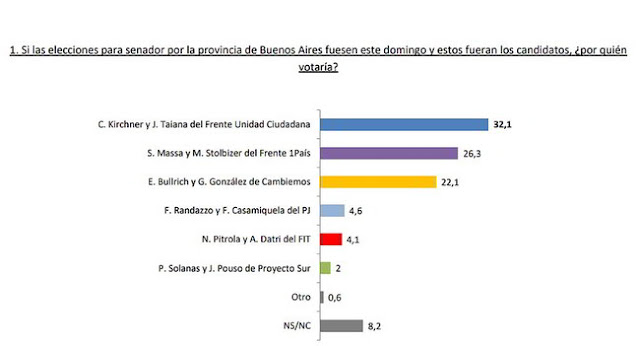 La fórmula de la expresidente y el canciller suman el 32,1% y la dupla de 1País alcanza el 26,3% de las voluntades. En este estudio, el candidato de Cambiemos Bullrich también se posiciona tercer con 22,1% de los votos, mientras que Randazzo ocupa el cuarto con 4,6%.