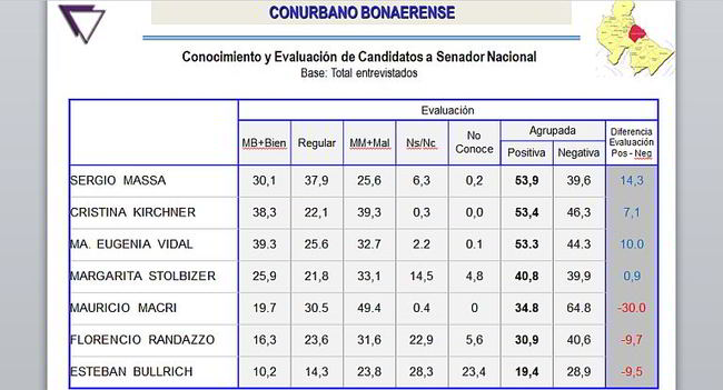 Un sondeo de la consultora de Hugo Haime, con un total del 63,2% de los votos, las listas encabezadas por Cristina y Massa se impondrían en las PASO en el Conurbano bonaerense, que concentra unos 8 millones de electores, dos tercios del total de la Provincia.