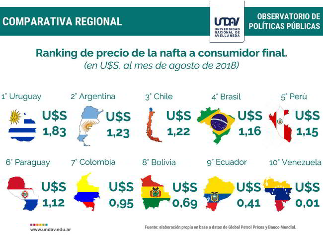 A la hora de analizar la situación en Latinoamérica, el relevamiento ubica a la Argentina es el segundo país con mayor costo de los combustibles al consumidor final, con un precio de u$s1,23 el litro de nafta. Detrás se ubican Chile, Brasil, Perú, Paraguay, Colombia, Bolivia, Ecuador y Venezuela. Sólo es superado por Uruguay.