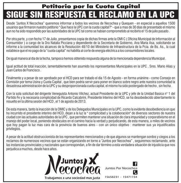 Desde “Juntos X  Necochea” queremos informar  a todos los vecinos de Necochea y Quequen  – en especial a aquellos 1500 usuarios que firmaron nuestro petitorio  » Que hace la UPC con la cuota capital ? «