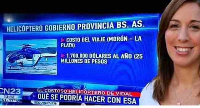 Jorge JImmy CanaleAsí llega María Eugenia Vidal de La Plata a Morón cada día, utilizando un helicóptero que al estado o a nosotros los contribuyentes de la Provincia de buenos Aires, nos cuesta 15,000.000 u$s al año, (eso mientras no sigan subiendo los combustibles, por ahí a fin de año, nos quedamos cortos con el dato). Acá la vemos descendiendo en el Aeropuerto de Morón, detrás su guardaespaldas, la espera su chofer, o el chofer de su ex marido, en una cuatro por cuatro TOYOTA PRADO, LAS MAS CARAS DEL MERCADO TOYOTA, en este caso, un sábado de mayo por la mañana. La gobernadora, Vidal, recién separada de su esposo el intendente de Morón, está realizando una reparación de $ 660.000 $ (lo que vale una propiedad media), Lo va a realizar en la casa que le «SOLICITÓ burocrática mente y amablemente» al comandante y Administrador del Aeropuerto, el cual ahora, quieren fundamentar con artimañas «cambiantes», que está en peligro de derrumbe, que todas las escuelas DE VUELO, formadoras de pilotos civiles, pasaran enfrente, es decir, donde a ella no la van a molestar los periodistas, los pilotos, el jardinero, los ciudadanos o la gente del aeropuerto mas viejo de la Argentina, el primero en construirse y que se conserva intachable!… una vergüenza mas de cambiemos por lo peor!!! Año 2016, año de la vergüenza Nacional!!! Díganme si no es una imagen digna de olvidar!… PERO A ESTO, EL GOBIERNO ELECTO POR LAS CORPORACIONES INTERNACIONALES, LE LLAMA CAMBIAR O CAMBIEMOS!!!!! ESTO, ES LO QUE E YO LLAMARÍA, CAMBAR YEGUA, POR MULITA!, Y LO PEOR, ES QUE MEDIO PAÍS, MAS UNO LES CREYERON!!!!