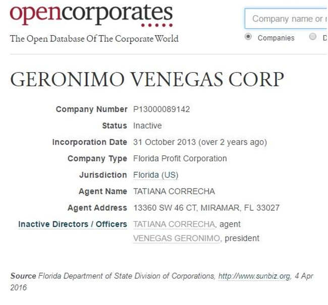 El escándalo de la filtración de 11 millones de documentos del estudio Mossack Fonseca también golpea al sindicalismo argentino. Entre los primeros nombres que surgieron a la luz se encuentra el de Gerónimo Venegas. El titular de la UATRE y líder del Partido FE, presidió GERONIMO VENEGAS CORP, una firma radicada en 2013 en Florida. El holding que hace unos meses fue dado de baja -por lo que ya no está activa- había sido inscrito por el peón rural como una corporación doméstica. El socio del gremialista era Norberto Díaz, un hombre ligado al negocio de los seguros, también oriundo de Necochea como Venegas. Como si fuera poco, entre los nexos del propio Diaz figura Alejandro Urtubey, hermano del gobernador salteño Juan Manuel Urtubey, empresario automovilístico de categoría Top Race, y uno de los titulares de la firma local Nitralcó.