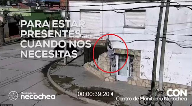Al no poder ingresar, el sujeto se trepa al balcón del primer piso del hogar, abriendo una persiana y la ventana para así conseguir ingresar. Según el contador de tiempo del propio video, se puede comprobar que un móvil policial llega al lugar en escasos 90 segundos.