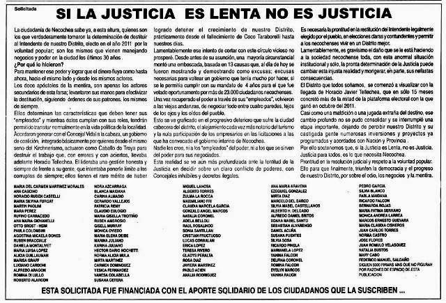 El pasado domingo fue publicada en el diario local una nueva y no menos contundente solicitada. En la misma, más de «5000 firmas» de ciudadanos de nuestro distrito piden “prontitud en la resolución judicial” respecto de las 13 causas abiertas al intendente destituido Horacio Tellechea.