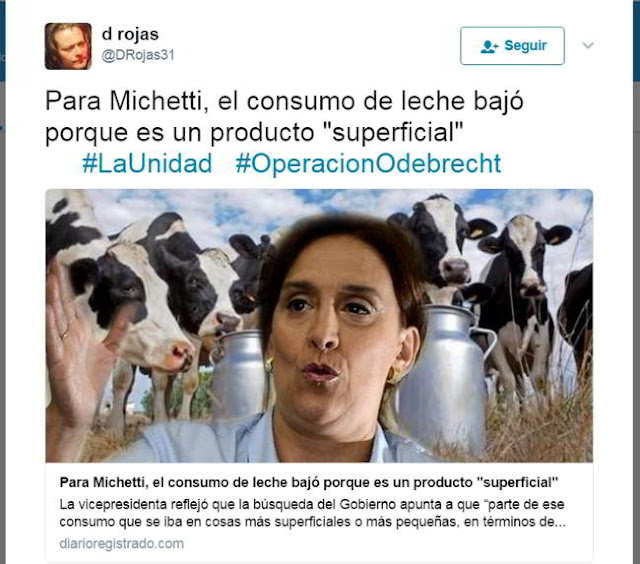 El pensamiento de la vice presidenta Gabriela Michetti. «La gente debe dejar de gastar en cosas superficiales… como la LECHE». pic.twitter.com/C1xI8nqVGY— Azucena Ayala (@AyalaAzucena) 25 de mayo de 2017