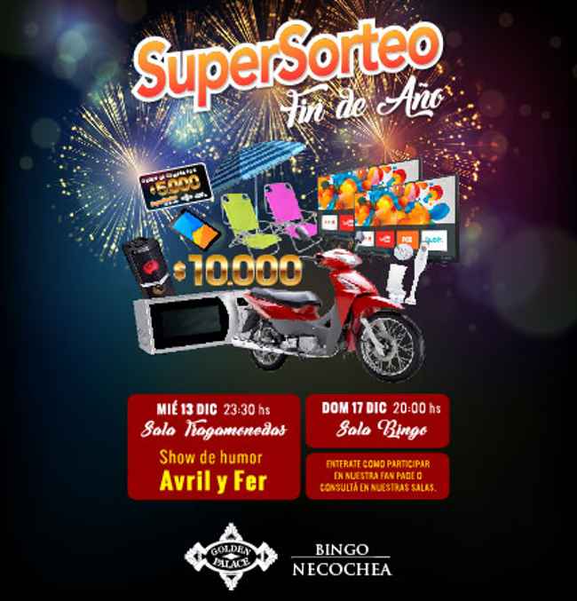 Cerrando un año de grandes premios e innovaciones, hoy a partir de las 20, Bingo Golden Palace te invita a la Sala de Bingo Cartón donde se realizarán sorteos de increíbles premios. Además de los asegurados a bingo, y sorteos “sale o sale” de siempre, los presentes participarán por un Smart Tv 43”, un sistema de audio y un horno microondas.