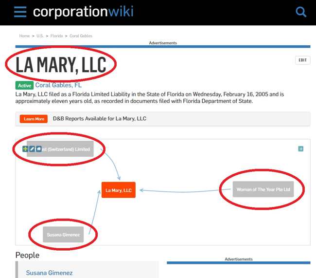 En el mismo estado de Florida y en el mismo año dio de alta otra firma más, LA MARY, LLC, en Coral Gables, Florida, de la cual fue CEO.