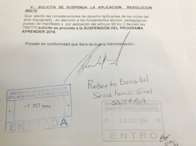 Dado que están presentándose cientos de renuncias de directores y docentes a asumir tareas impuestas de veedores y/o aplicadores del Operativo, la DGCyE está ejerciendo acciones de presión para detenerlas. Ante esta situación, el SUTEBA presentó una impugnación provincial a la implementación del Operativo Nacional de Evaluación «Aprender 2016», interponiendo un recurso de revocatoria y jerárquico en subsidio contra la Resolución 480/16.