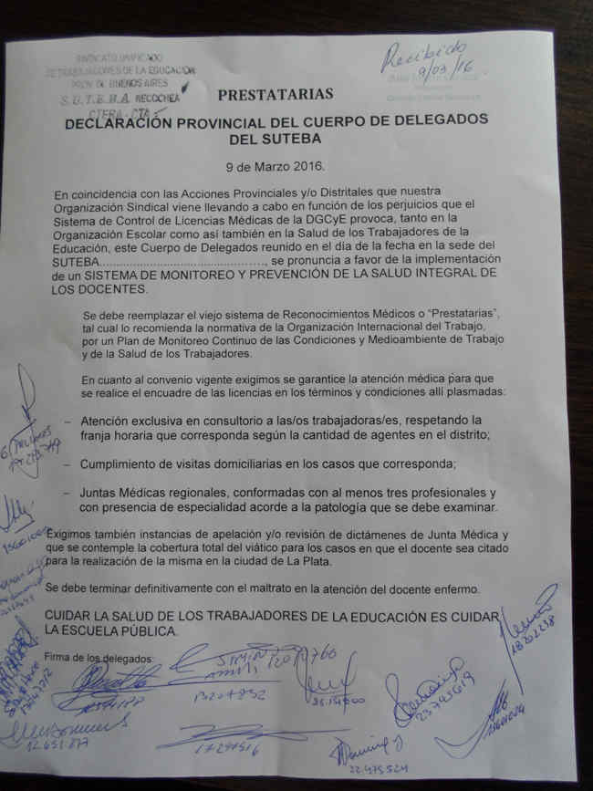 En la mañana del día miércoles 9 de marzo el cuerpo de Delegados del SUTEBA Necochea, junto a su Secretario General, Julio Perrotta, hizo entrega a las autoridades del Consejo Escolar local de un petitorio solicitando la implementación de un sistema de monitoreo y prevención de la salud integral de los docentes.