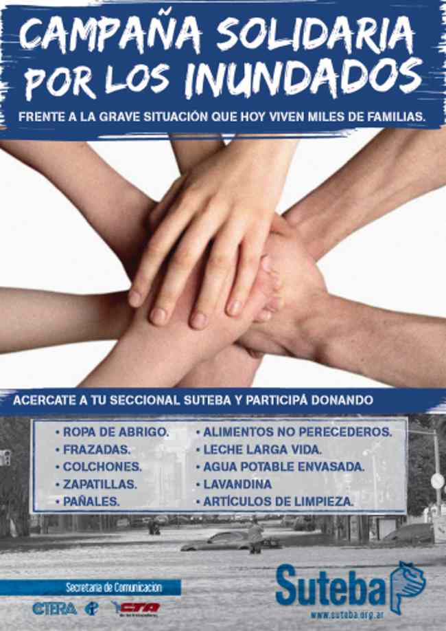 El Sindicato Unificado de Trabajadores de la Educación de la provincia de Buenos Aires (SUTEBA) está desarrollando una campaña solidaria con el fin de asistir a los damnificados por las inundaciones en distintas localidades bonaerenses.