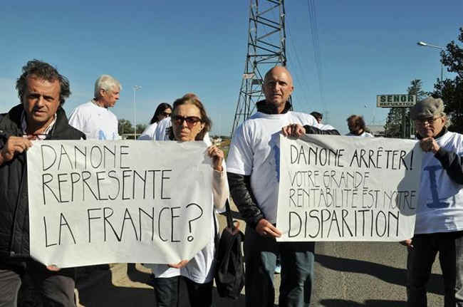 Los carteles en francés tenían mensajes como «Danone Basta! Tu gran rentabilidad es nuestra desaparición», «¿Danone representa a Francia?», «Ustedes no quieren dialogar con los productores, ¿por qué»?, «Danone, basta de amenazas y limosnas».
