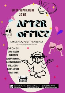 A las 20:00 horas, After Ofice. Pandemia/postpandemia. Muestra de la Tecnicatura de Artes Visuales de la Escuela Provincia de Artes “Orillas del Quequén”, en el marco de la Semana de las Artes. Exponen China Olivera, Iñaki Galea, Lorena Belmudez, Martín Holzmann, Stella Cejas, Daniela Senra y Tomás Roque.