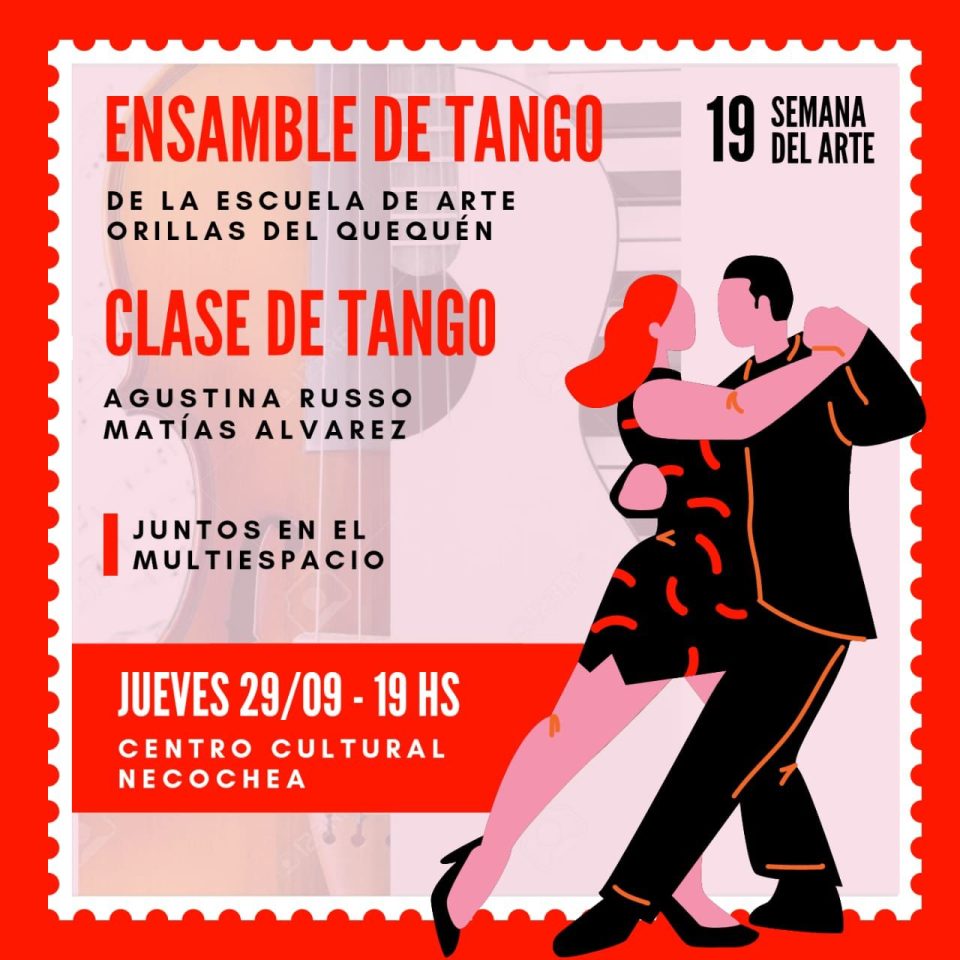 Clase de tango con música en vivo a las 19:00 horas. En el marco de la Semana de las Artes de la escuela Orillas del Quequén, la clase de tango de los jueves contará con la participación del ensamble de tango de la escuela. El ensamble está integrado por Natalia Massa (voz), Melisa Cáceres (voz y flauta), Pedro Cipolletti (clarinete), Ian Vázquez (piano), Virginia Reyes (violín), Bere Albelo (voz y guitarra) Cochecho Aguirre (contrabajo). Dirigidos por el profesor Sergio Crotti (guitarra).