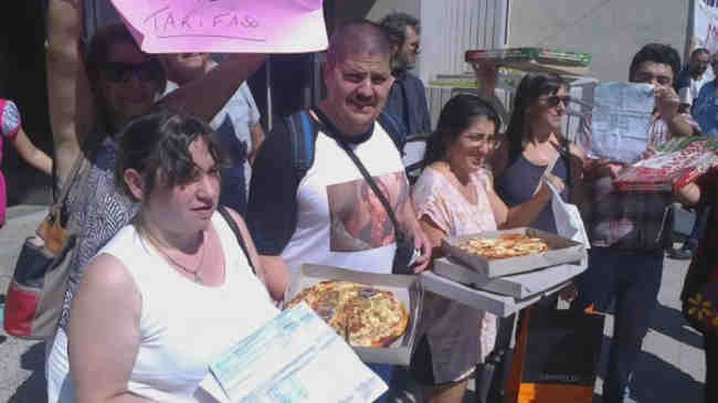 Un grupo de vecinos, con pizzas en la mano, intentó pagar el aumento de luz de sus respectivas boletas con pizza.