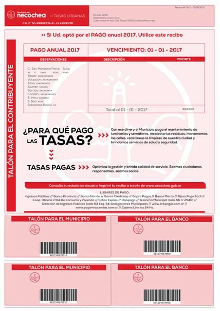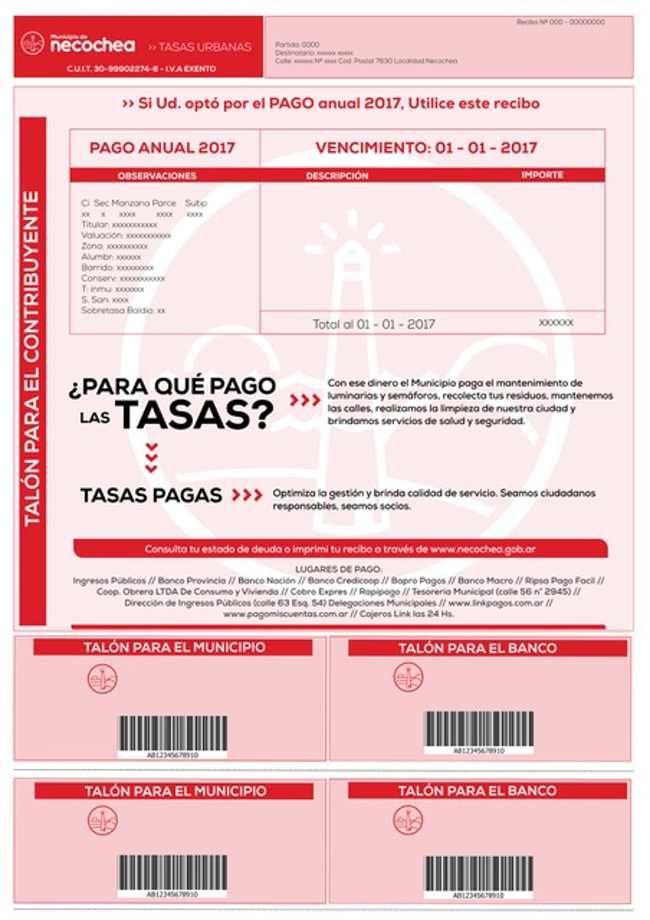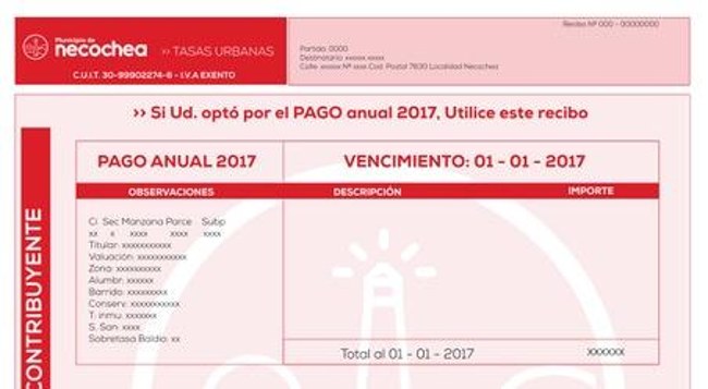 Las tasas con descuento por buen cumplimiento pueden obtenerse entrando a la página www.necochea.gov.ar/tasas-municipales/ o acercándose a las oficinas municipales ubicadas en la esquina de calles 63 y 54.