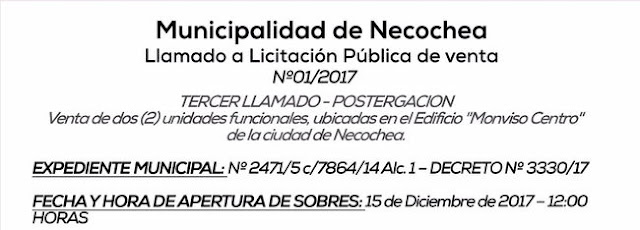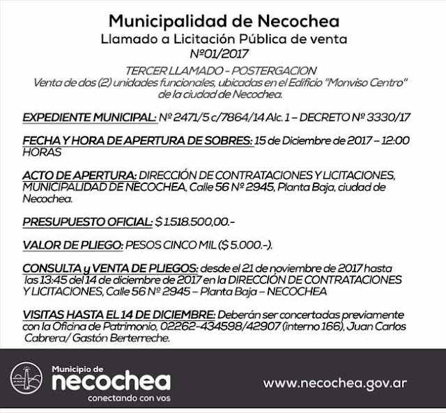 La Municipalidad de Necochea ya abrió el tercer llamado a licitación pública para la venta de dos unidades funcionales en el Edificio Monviso Centro, y cuyo presupuesto oficial es de 1.518.500 pesos.