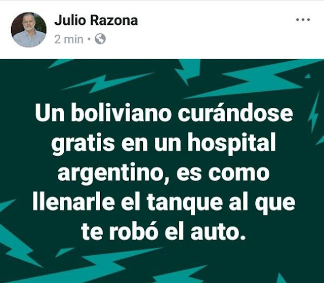 Este martes 27 de febrero, a las 16 horas, el Dr. Julio Razona, quien además de ser funcionario de la Municipalidad de Mar Chiquita, se define en la red social como “Abogado, Especialista en Derecho Penal, Titular del PRO-General Pueyrredón y Presidente de la Fundación Investigación Ciudadana, escribió en Facebook: “Un boliviano curándose en un hospital argentino, es como llenarle el tanque al que te robó el auto”, realizando una desafortunada comparación entre la comunidad boliviana y los delincuentes.