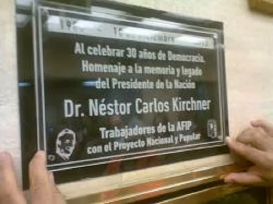 Con motivo del 30º aniversario del regreso a la Democracia, previo a la Fiesta Popular realizada por el Gobierno Nacional en Plaza de Mayo, los Trabajadores de la AFIP con el Proyecto Nacional y Polpular homenajearon al Ex Presidente Néstor Kirchner con la colocación de una Placa en su Memoria en el Hall Central del Edificio de la AFIP, Hipólito Irigoyen 370, el pasado martes 10 de diciembre.