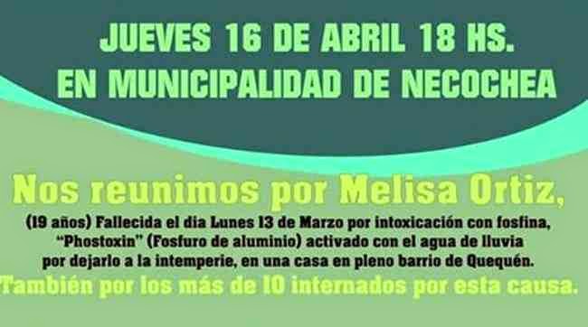 El objetivo será exigir justicia por la muerte de la joven Melisa Ortiz y por la decena de personas hospitalizadas a causa de la inhalación de fosfina, luego de la explosión de un depósito de Phostoxin ocurrida el día Lunes 13 de Abril por la tarde.