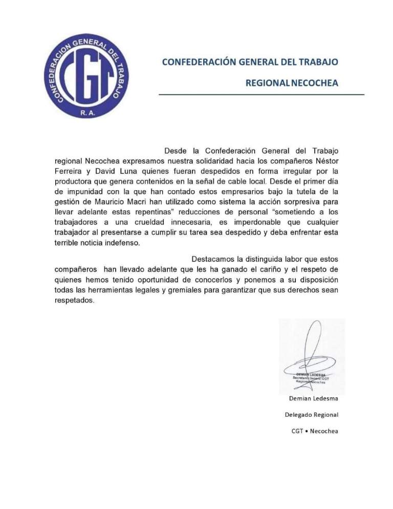 Además, la seccional Necochea de la CGT lanzó un comunicado señalando las prácticas del empresariado en tiempos del gobierno de Mauricio Macri: