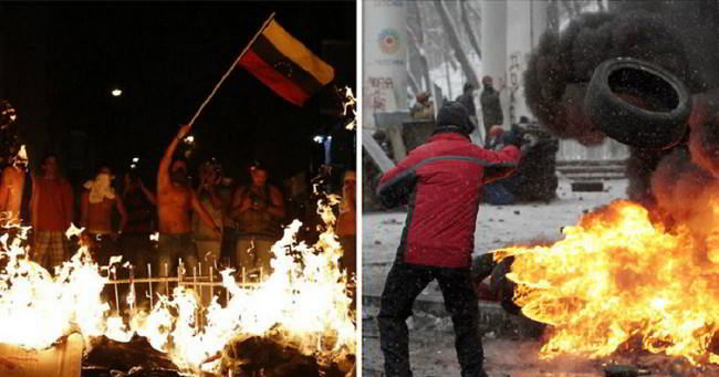 En Ucrania, las protestas de estos grupos contrario al gobierno se auto definían como pacíficas, con demandas concretas (en Venezuela elecciones generales, en Ucrania para forzar al presidente Yanukovich a firmar un tratado de asociación con la Unión Europea) y acciones de calle organizadas que cada día fueron reemplazadas por focos violentos, cierre de avenidas, asesinatos selectivos, manipulación mediática y montaje de fake news (noticias falsas).
