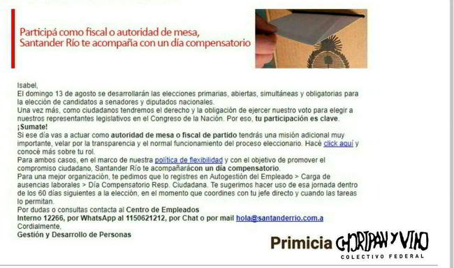 Por si te queda alguna duda de que la Segunda Alianza #Cambiemos y #Macrigato son los ricos gobernando para los ricos esto es lo que le envía el Banco Santander a cada empleado: «El Banco Santander te invita a fiscalizar las PASO para Cambiemos, y te da un día de franco compensatorio. Lo que se dice un Banco Militante. No podemos tener dudas de quien está de cada lado.»
