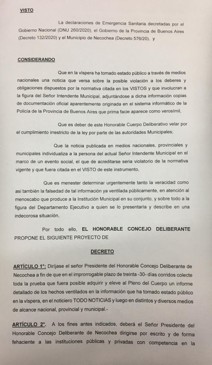 Un proyecto presentado por cinco concejales y votado por unanimidad, solicitando que el Presidente del Concejo Deliberante pida información oficial sobre el informe de un medio capitalino sobre una acción violando la cuarentena por parte del intendente Municipal, Dr. Arturo Rojas.