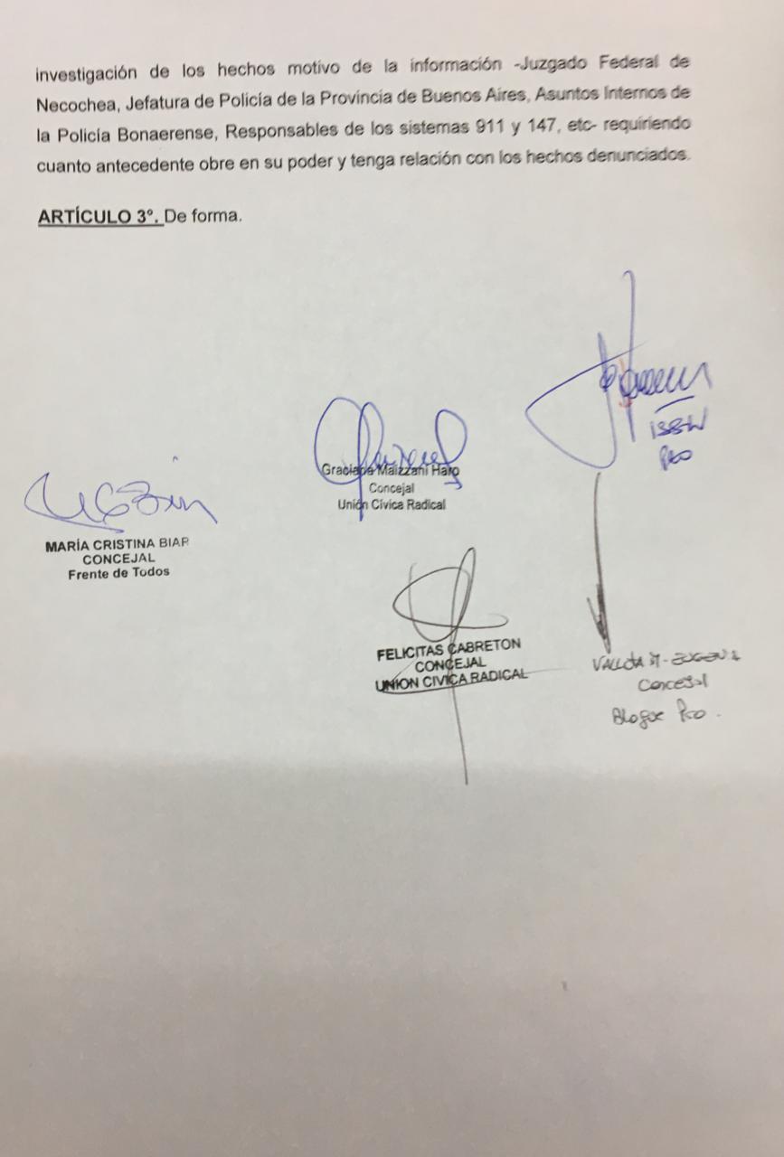 El proyecto de Resolución fue firmado por las concejalas María Cristina Biar del Frente de Todos, Graciela Maizzani Haro y Felicitas Cabretón de la Unión Cívica Radical, Eugenia Vallota del PRO y el edil inhabil Alejandro Izzin, lo que significa que fue propuesto solo por las concejalas legales.