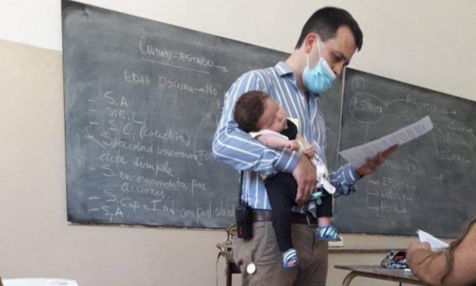 El texto de su cuenta de Facebook que ya tiene casi 1100 reacciones y más de 1500 compartidos, culmina: «Encima que la cuidó mientras yo estudiaba también la hizo dormir. Lo aplaudo profe, la verdad un GENIO!!!! Por más profesores así, para que todas aquellas mamás puedan terminar el colegio.»