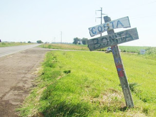 Viniendo desde Quequén, está el cartel que hizo el Tío Mario. Me pregunto, si Costa Bonita está en los mapas, porque no está correctamente señalizada (con carteles verdes y blancos) ??