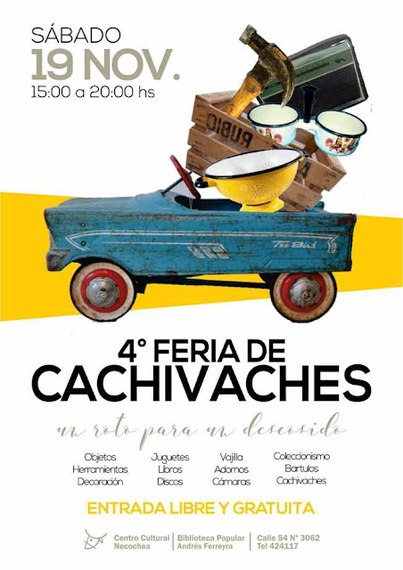 Este sábado estaremos de feria nuevamente en el Centro Cultural de Necochea! Desde las 15 hasta las 21hs, nuestro Auditórium se llenará de cachivaches, curiosidades y antigüedades. Con entrada libre y gratuita se podrán recorrer unos 15 stands, con la mas variada oferta de objetos con historia para revolver, comprar y regatear.