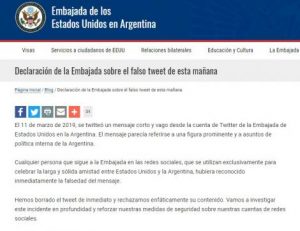 A las 11:16, el usuario oficial de la sede diplomática -@EmbajadaEEUUarg- publicó la curiosa frase. Luego de eliminarla, postearon en inglés y en español la explicación oficial: “Borramos el tweet de nuestra cuenta que no posteamos nosotros. No sabemos todavía cómo sucedió, pero estamos investigando”.